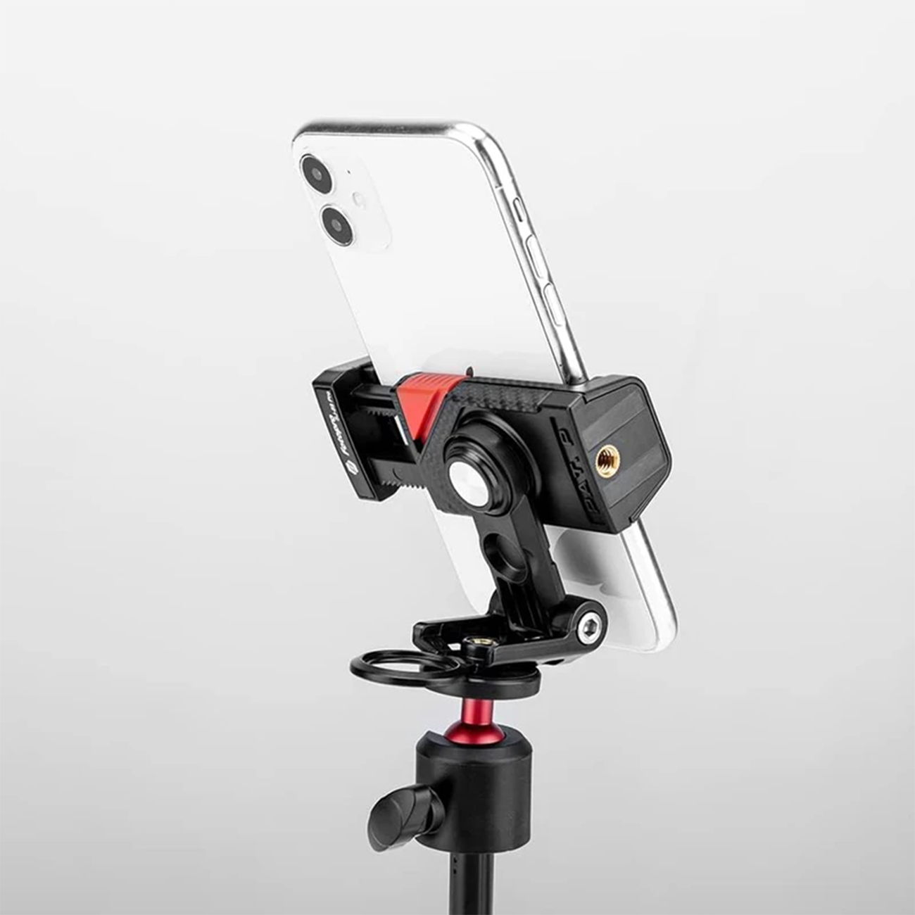 قابلیتهای اتصال و توسعه (Cold Shoe) برگ برنده این مدل، وجود درگاه Cold Shoe در قسمت بالایی آن است. این ویژگی به شما اجازه میدهد تا میکروفونهای حرفهای یا نورهای LED کوچک را مستقیماً روی بدنه گیره نصب کنید. علاوه بر این، در قسمت پایینی گیره، علاوه بر پیچ استاندارد ۱/۴ اینچی برای اتصال به سهپایه و مونوپاد، یک مانت کفشک سرد نیز تعبیه شده است که امکان نصب مستقیم گیره روی دوربینهای DSLR را فراهم میآورد. با قابلیت چرخش ۳۶۰ درجه، شما میتوانید در چند ثانیه از حالت فیلمبرداری افقی (مناسب یوتیوب) به حالت عمودی (مناسب اینستاگرام و تیکتاک) تغییر وضعیت دهید.