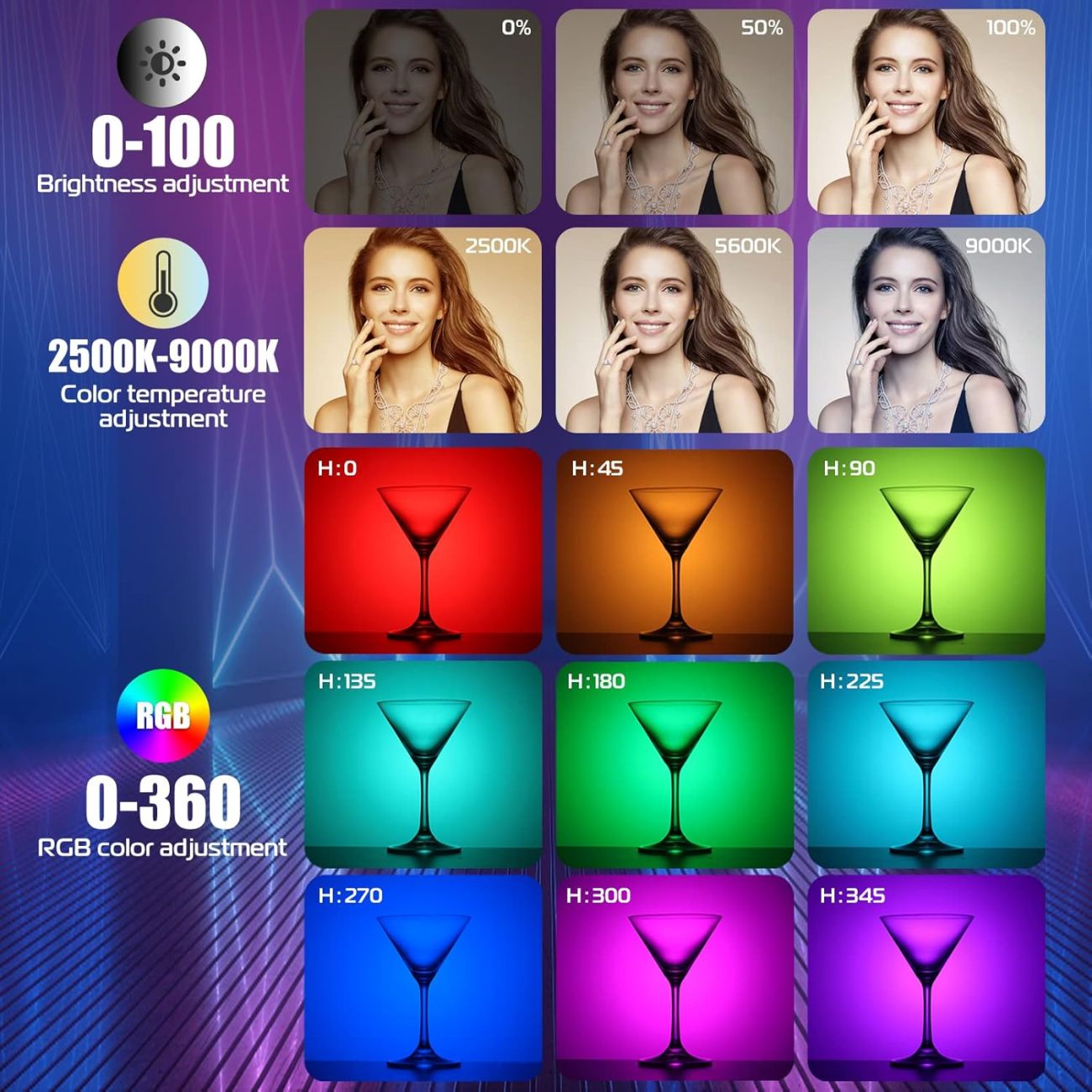 قابل تنظیم با رنگ کامل ۰–۳۶۰ درجه، دمای رنگ ۲۵۰۰–۹۰۰۰ K، و ۲۰ افکت نورپردازی پیش‌فرض
