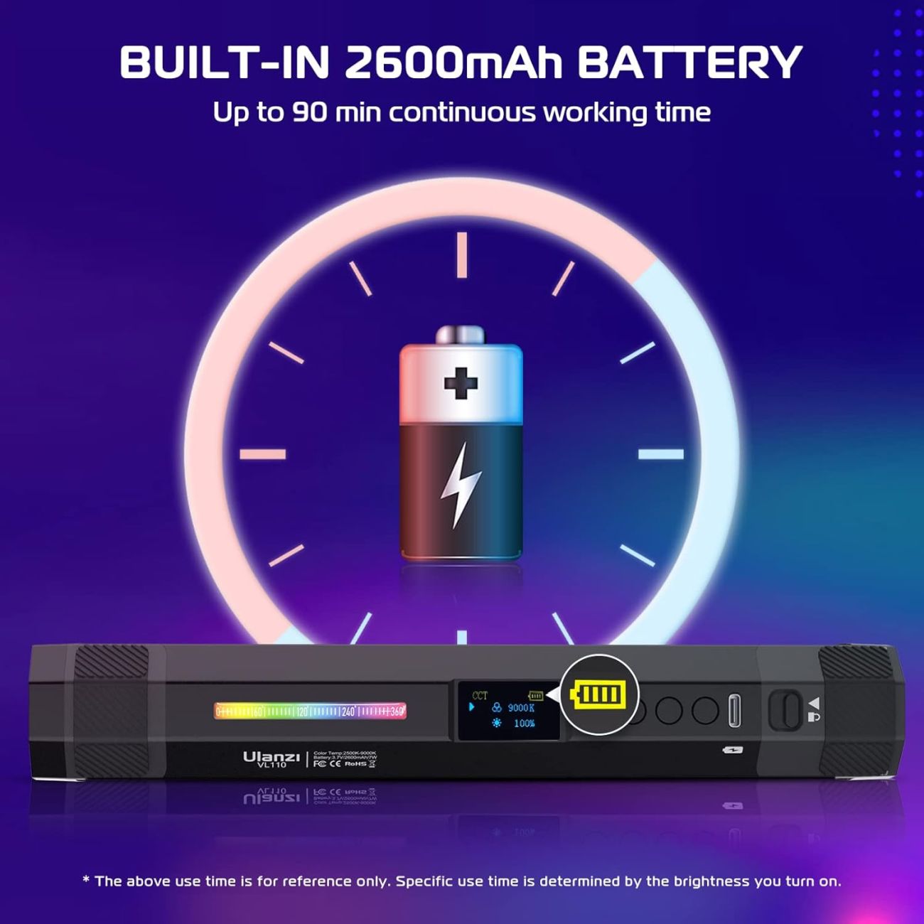 باتری داخلی ۲۶۰۰ mAh با زمان شارژ حدود ۱.۷ ساعت؛ و تا ۱.۵ ساعت عملکرد مداوم در حداکثر روشنایی، و تا ۳۰ ساعت در کمترین حالت