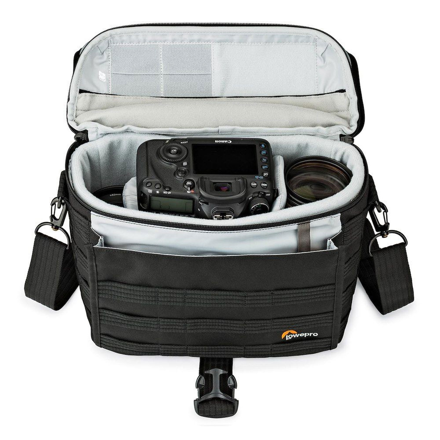 ظرفیت حمل دوربین DSLR به همراه لنز متصل به آن و یک فلاش یا لنز اضافی